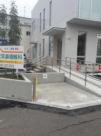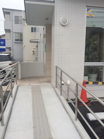 入口はスロープになっており、手すりが設置されています。